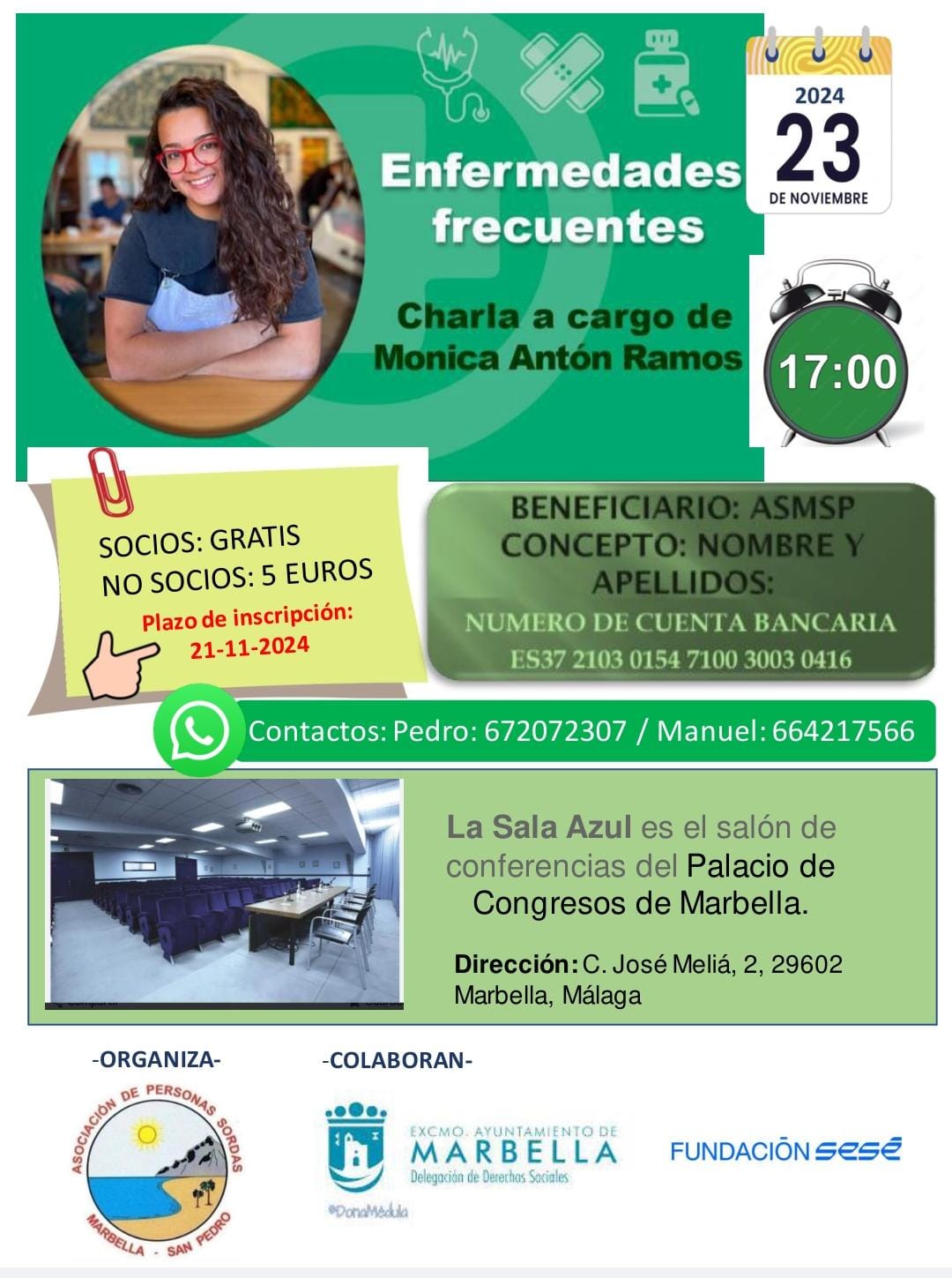 Adjunto cartel y video acerca de próxima Conferencia de «Enfermedades Frecuentes» que tendrá lugar el sábado 23 de noviembre en el Palacio de Congresos de Marbella