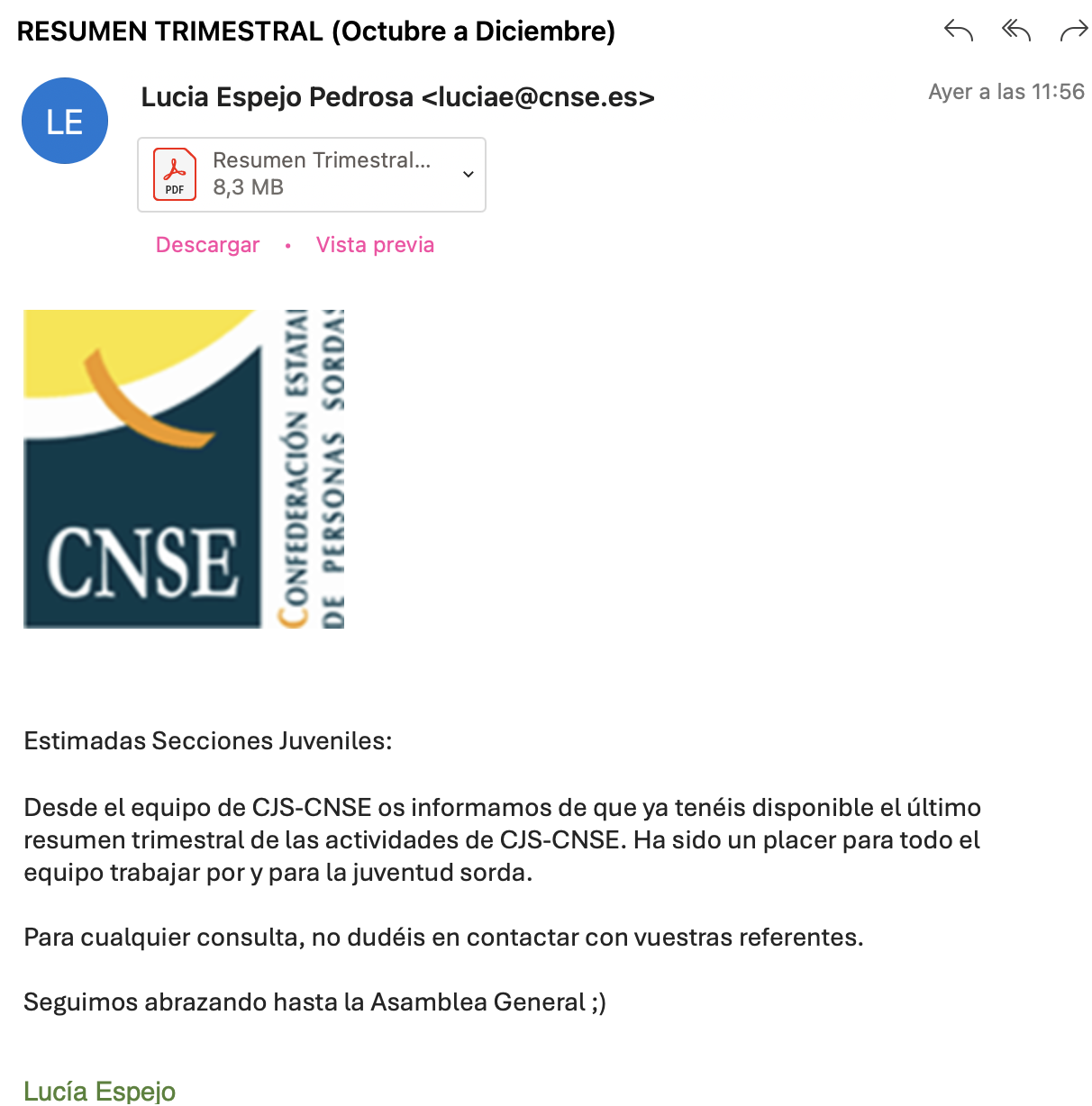 Desde la Comisión de Juventud Sorda de la CNSE os convocamos a la XXX Asamblea General de la CJS-CNSE. La XXIX Asamblea General de la CJS-CNSE se celebrará el sábado 22 de febrero a partir de las 9:00h en primera convocatoria y a las 10:00h en segunda convocatoria. Dicha Asamblea General se celebrará presencialmente en la sede del CJE (Consejo de Juventud de España).